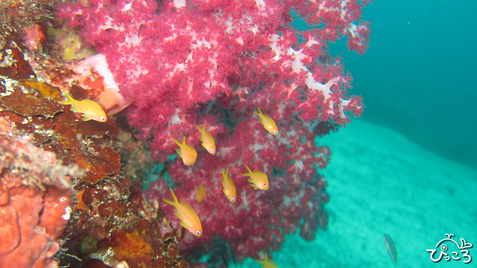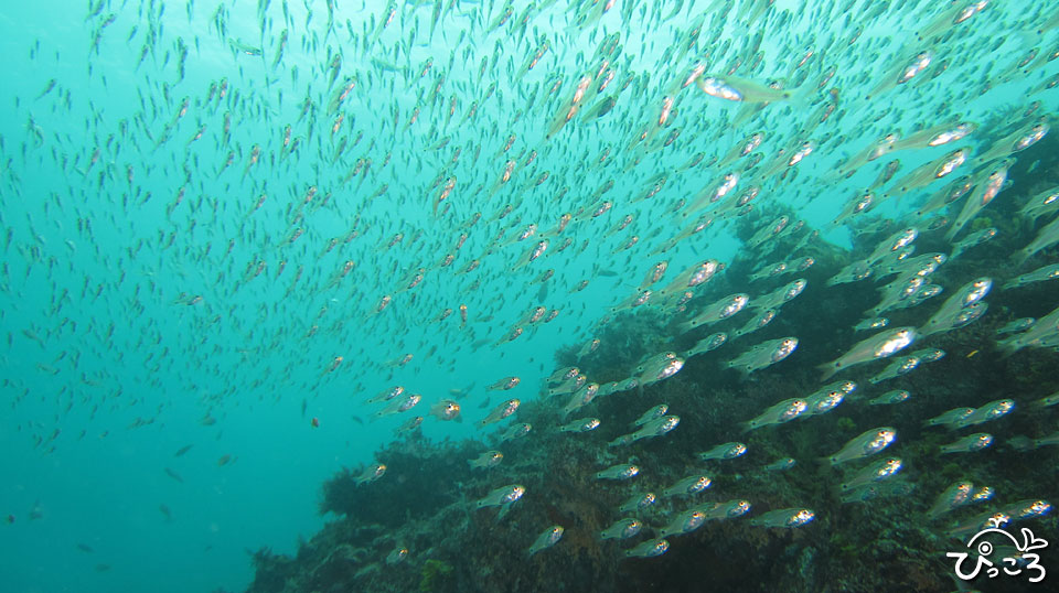他にもトビエイ、ネジリンボウ、ホウボウ、ヨウジウオ、オキゴンベ、イサキやクロホシイシモチの群れ