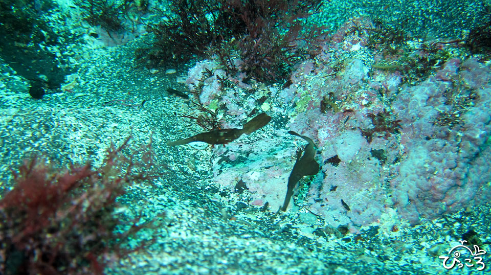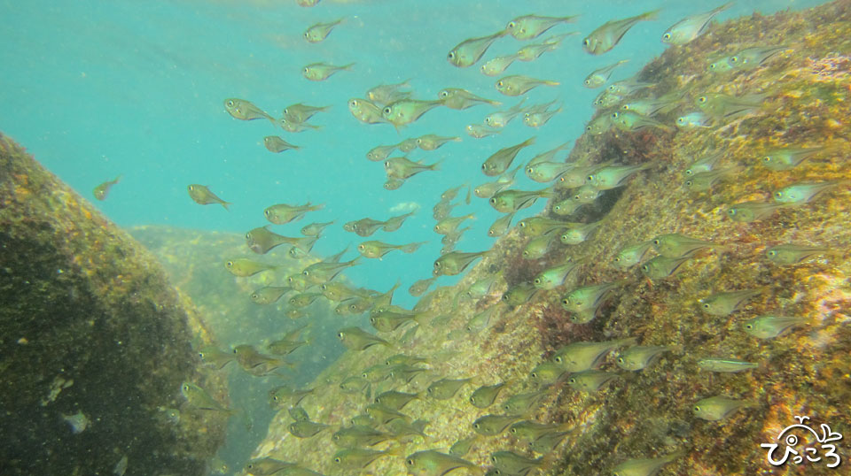 浅場の岩陰に群れるハタンポの幼魚。