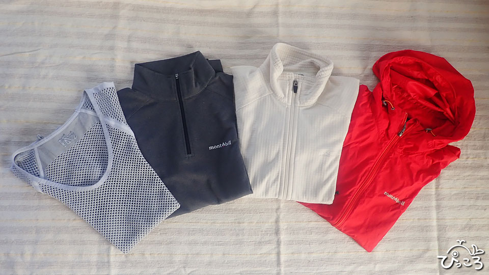 「速乾性シャツ+フリース+ウインドブレーカーで歩き、休憩時に寒かったら+ダウンジャケット、雨が降ってきたら+レインジャケットです」とお答えしました。