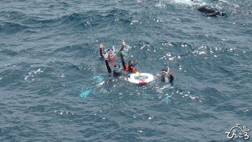 ウエットスーツを着て、マスク、スノーケル、フィンを付けて泳ぐ、スノーケリングです。