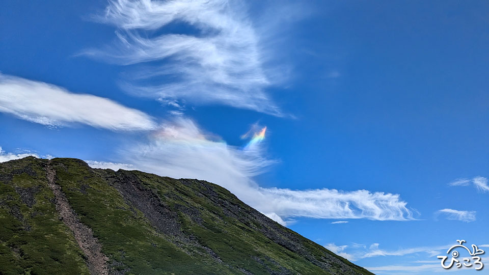森林限界を超え、空には虹色に光る雲、彩雲が!ラッキー♪