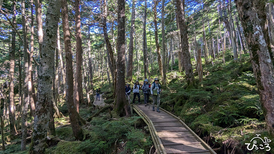 富士山の青木ヶ原樹海と似た雰囲気の針葉樹林帯を進みます。